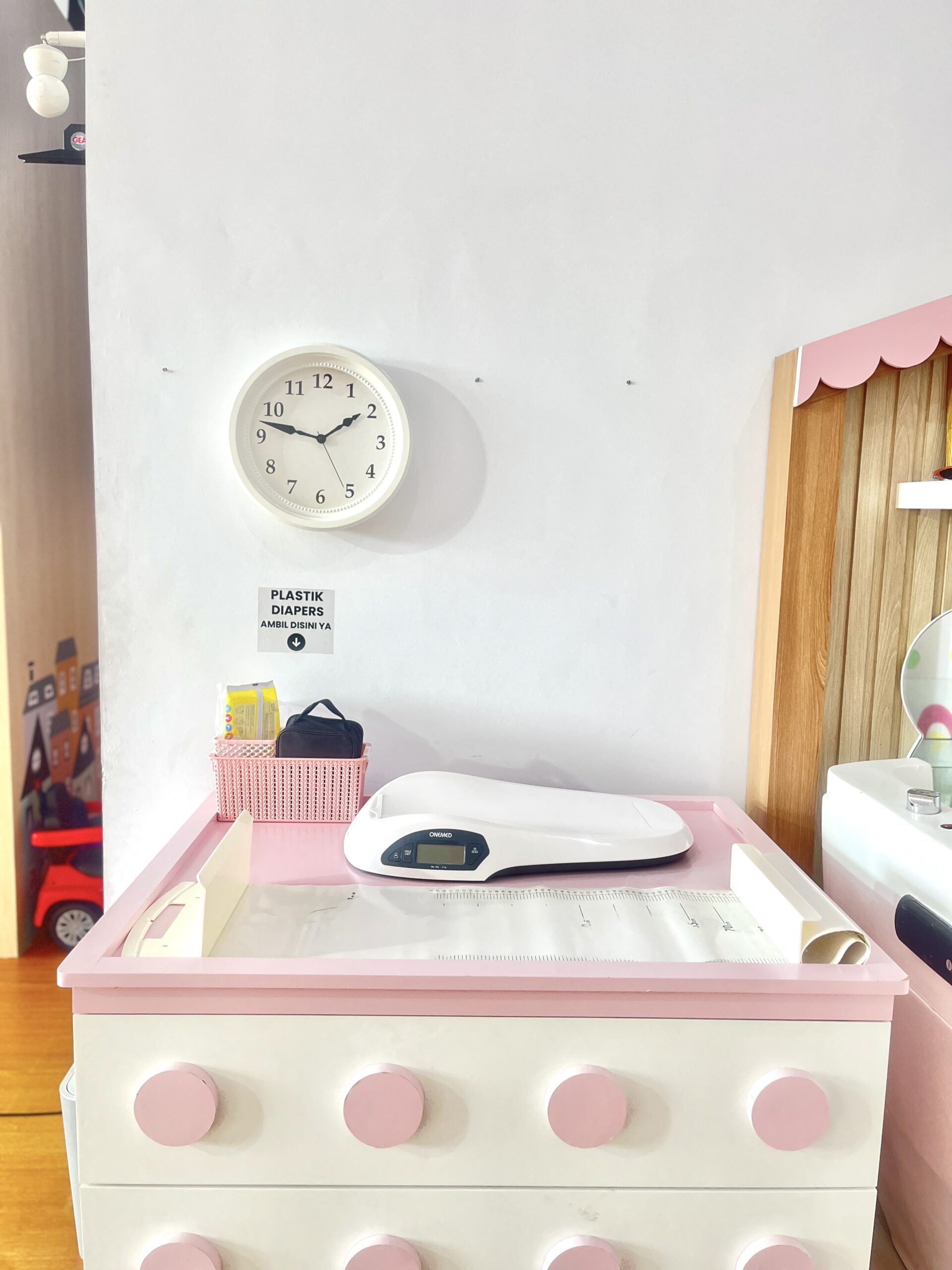 Ruangan ini terletak di Lantai 2 yang lengkapi dengan wastafel dan kursi. Bunda bisa memanfaatkan ruangan ini untuk mengganti popok si Kecil ya.